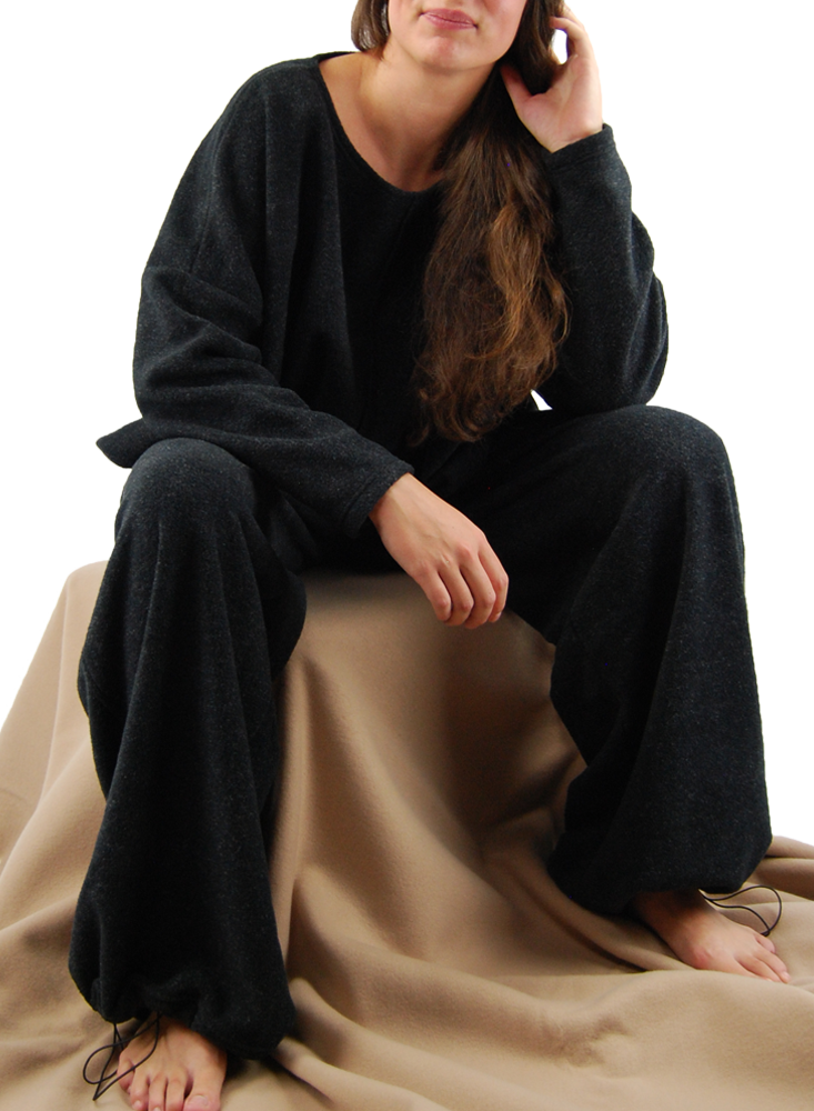 Warme huisbroek met elastiek in de taille en elastisch koord onder in de broekspijpen. De broek is gemaakt van gemeleerd fleece , is in een maat verkrijgbaar en zeker geschikt tot maat 50 maar ook voor kleine maten.